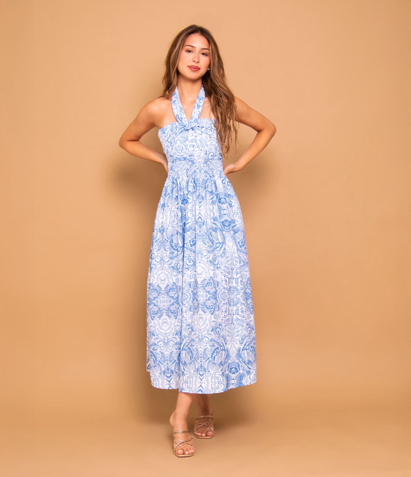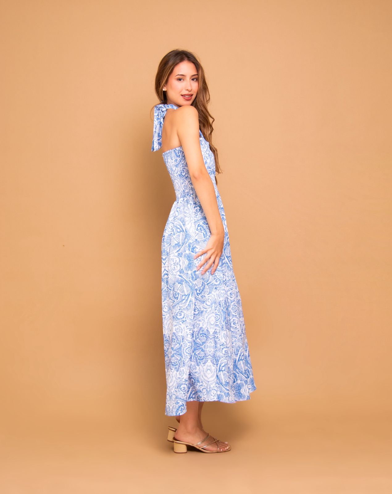 Vestido de seda estampado. La modelo utiliza el talle XP.